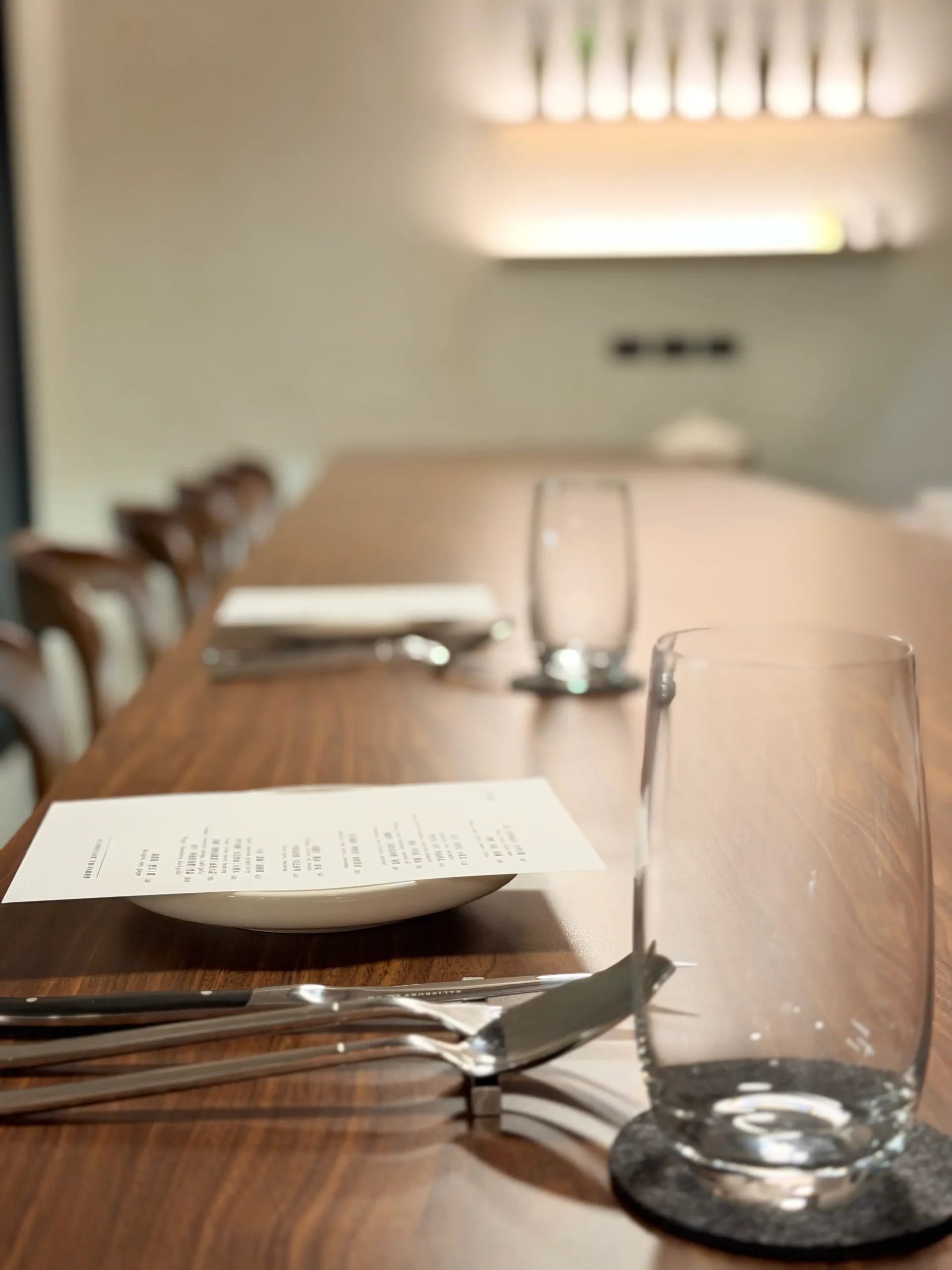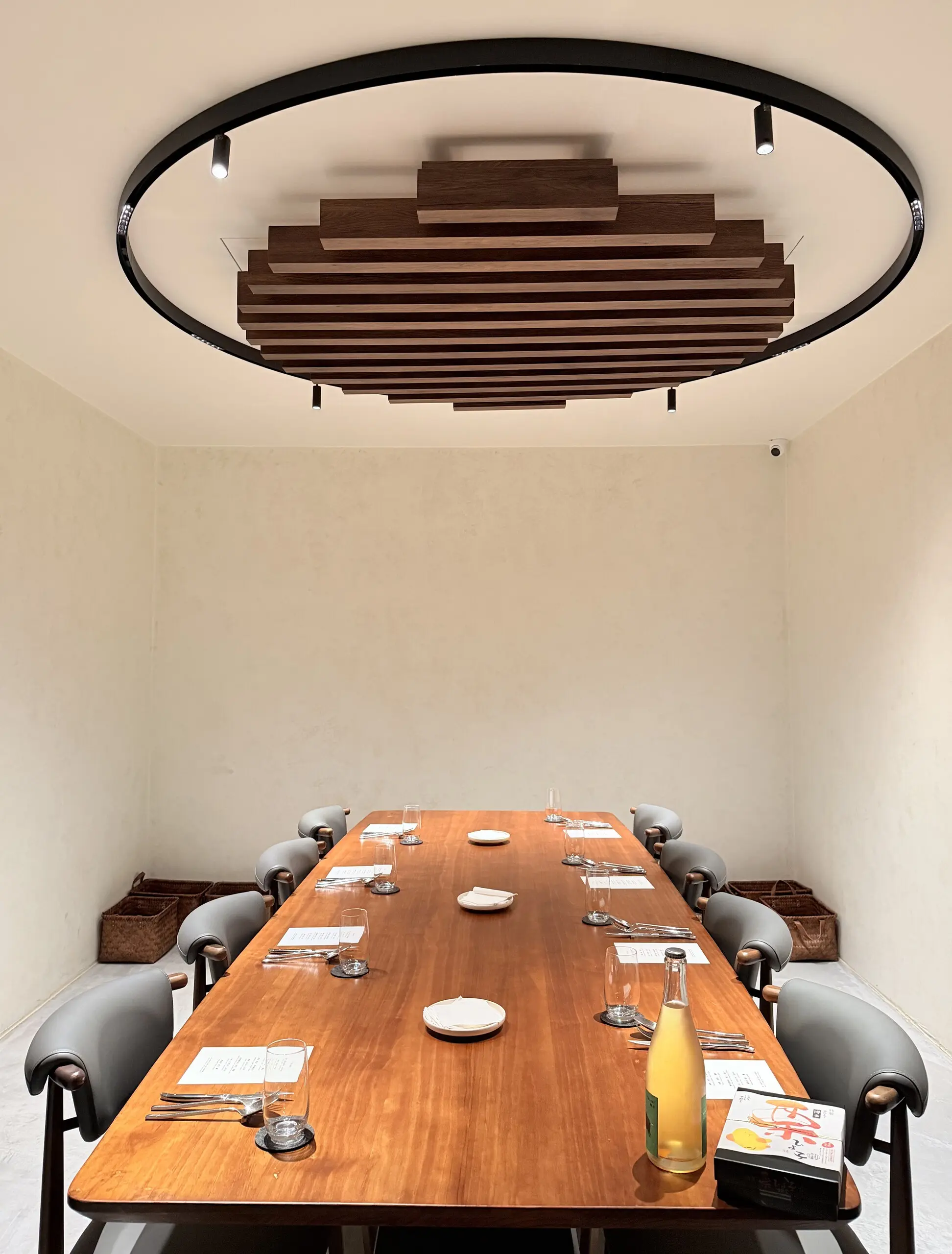 餐廳內部裝潢簡約而溫暖,映入眼簾的是開放式廚房搭配板前座位,用餐空間除了板前座位外也有桌位可以選擇,板前吧檯座位能夠近距離感受柴火的溫度與煙香,用餐過程本身就是一種體驗,另外也提供包廂可以預訂,有提供10人包廂與20人大包廂,是多人聚餐的好選擇,今天入座的是小包廂座位
