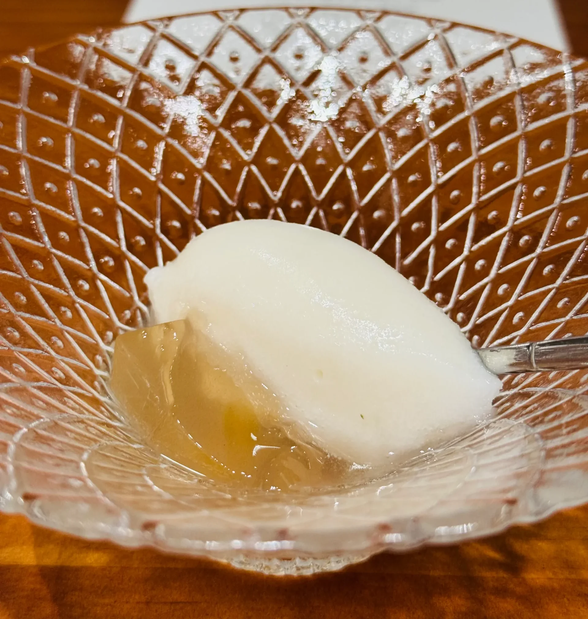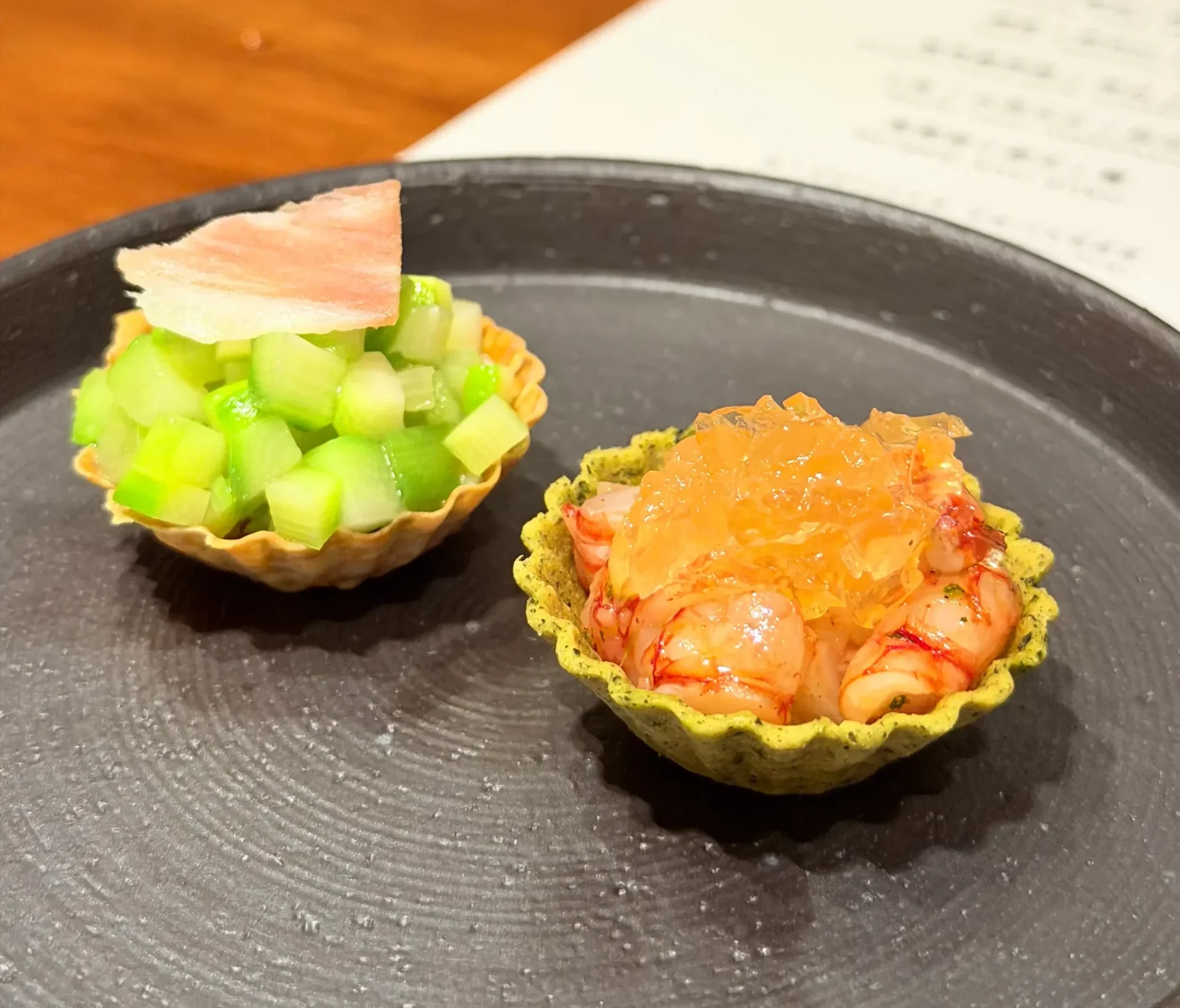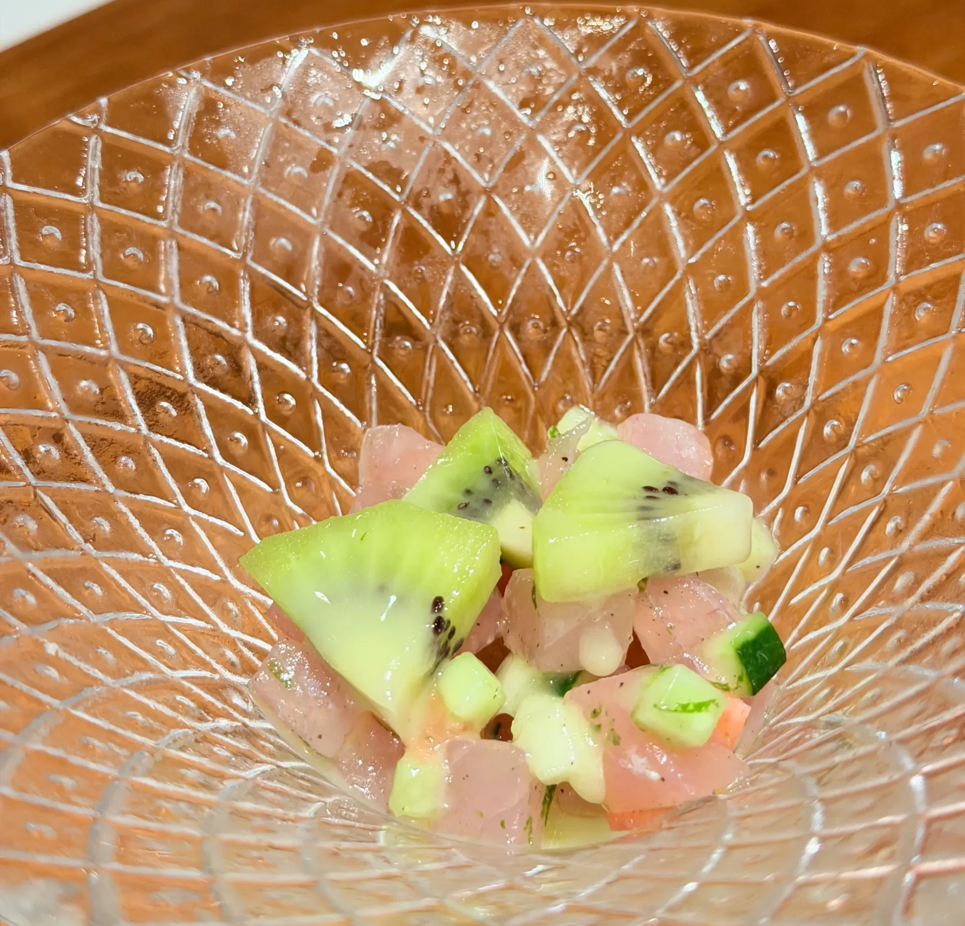 紅甘魚肉質緊實,油脂分布均勻,奇異果的酸甜提出紅甘的鮮美,搭配清爽的小黃瓜醬汁,整體輕盈而有層次