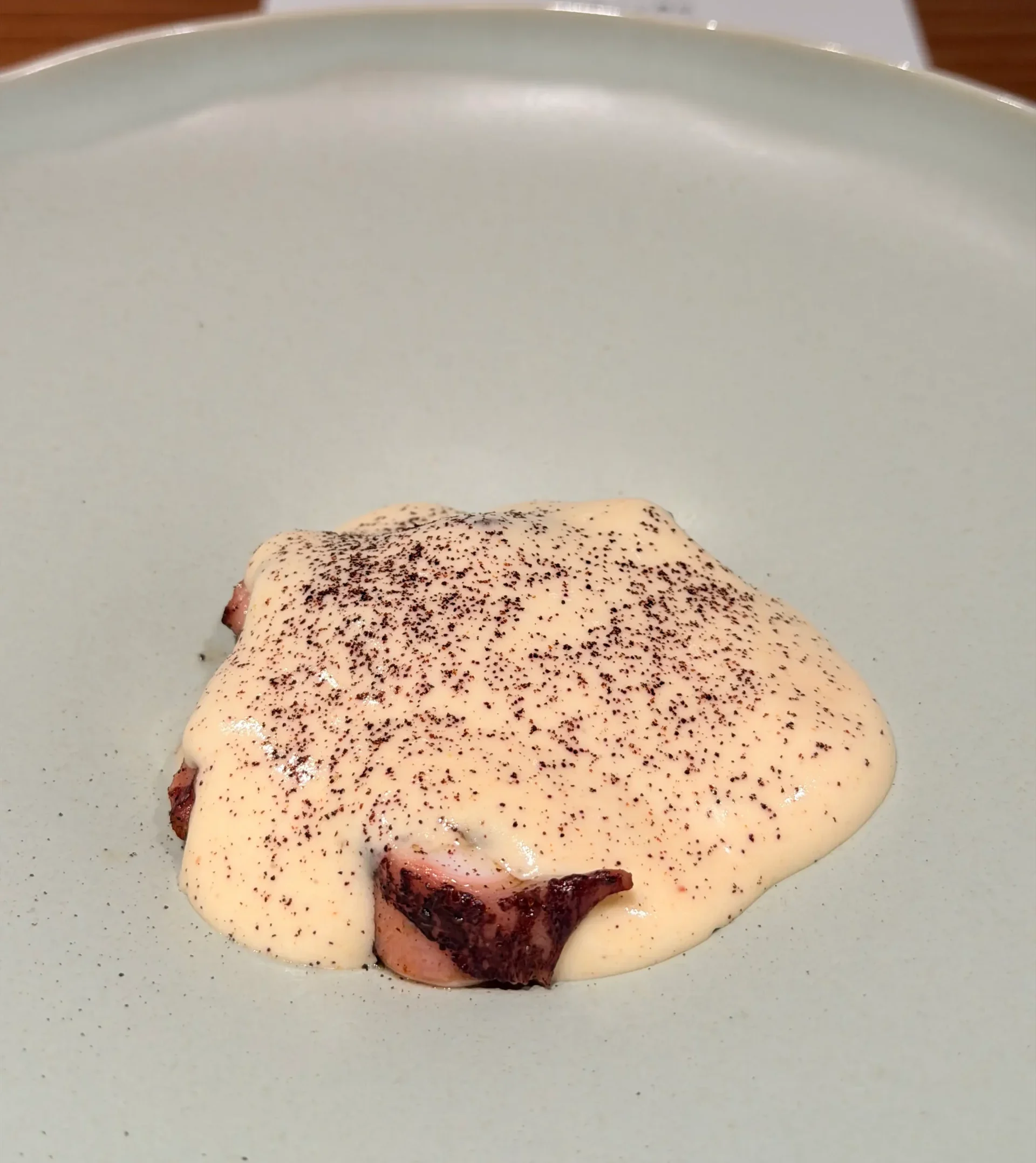 章魚以柴火慢烤,外層帶有迷人焦糖色澤與炭香,Q彈有嚼勁,再以細膩的馬鈴薯泡泡輕柔包覆,沒想過馬鈴薯能夠以這樣的形式呈現,很驚豔!