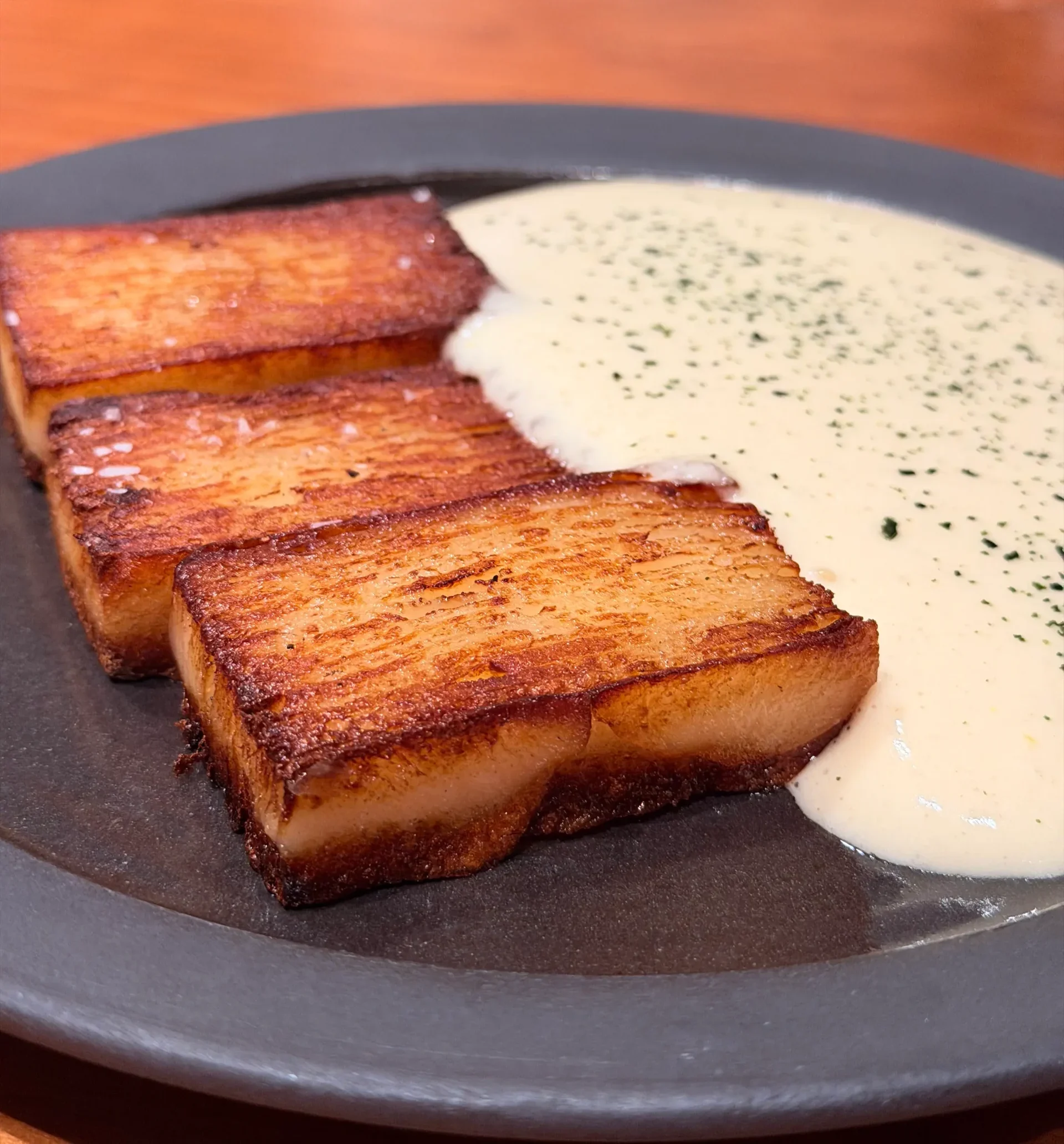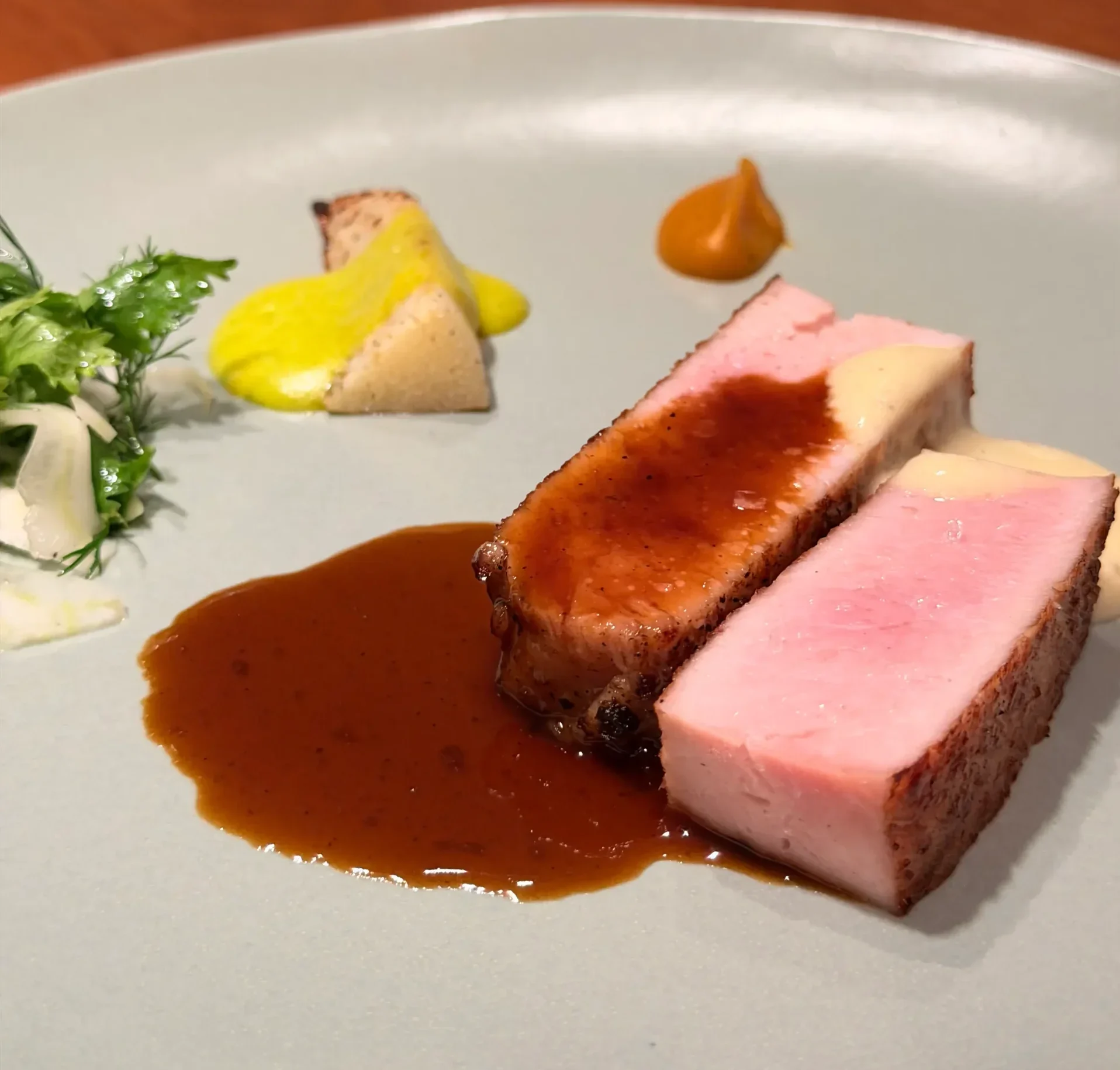 來自宜蘭的葛瑪蘭黑豬,肉質細膩、油脂豐潤,以相思木直火烤製,焦香撲鼻,切開後肉汁飽滿,茴香的清香平衡了油脂,一旁搭配的南瓜醬意外的適合!