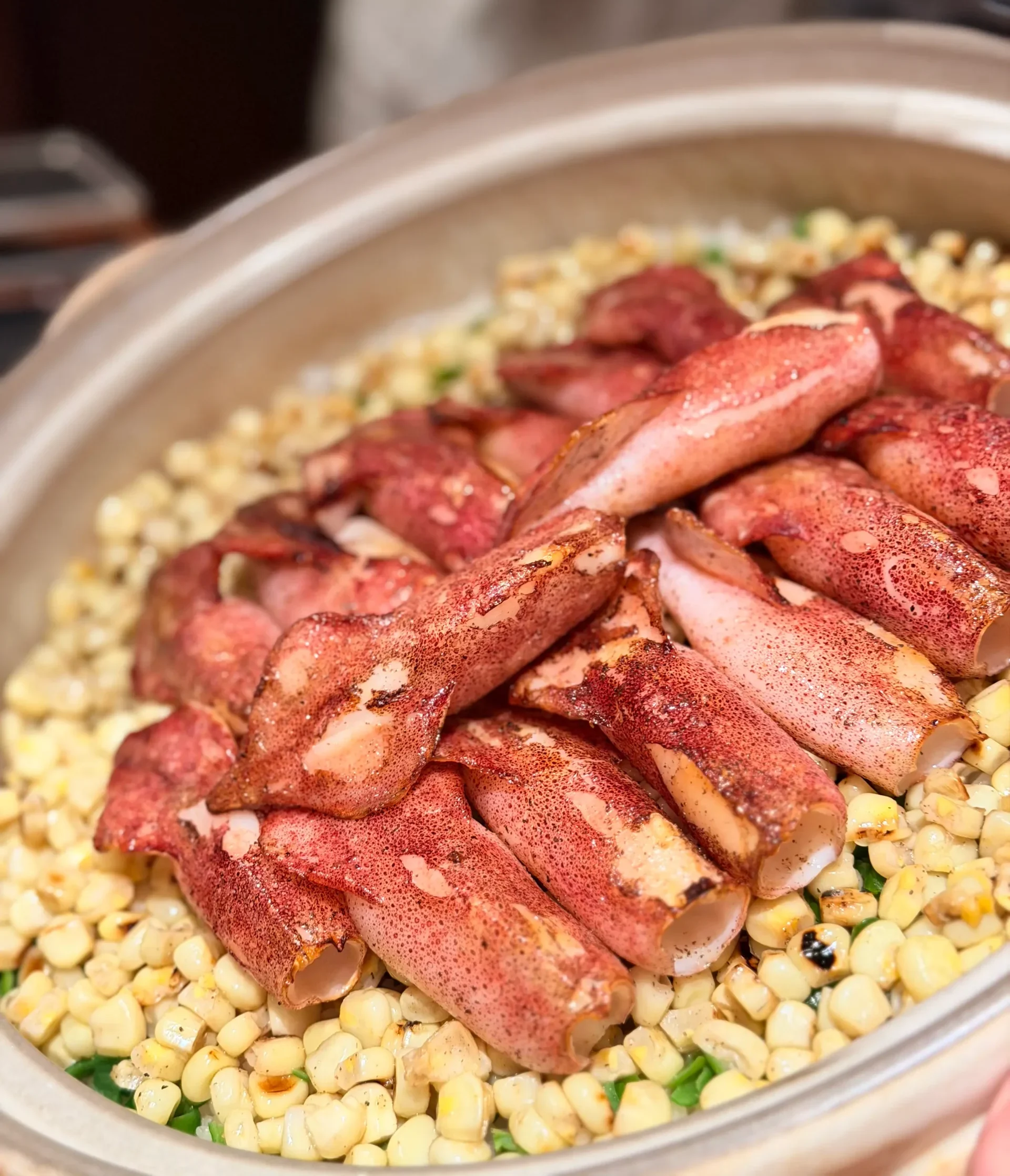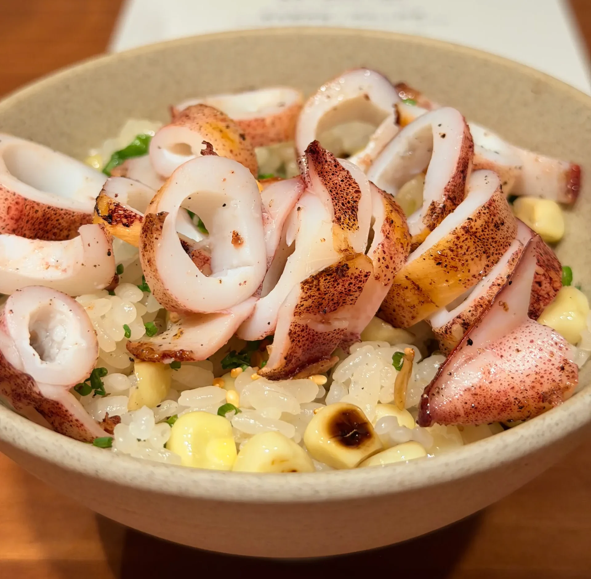 小卷以直火快炙,表面微焦,肉質Q彈鮮甜,炭香與海味交織,顆粒分明的越光米搭配高甜度的水果玉米,提升口感層次,非常好吃!