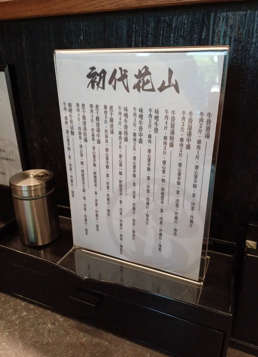 桌上的立牌菜單,菜單依湯底分為牛骨原湯、味噌牛骨、煮干雞清湯,根據配料多寡分為原湯、中盛、特盛,麵條選用台南老牌立成製麵的中粗麵,每碗可免費補一次半球麵,麵條也可根據喜好選擇軟硬度