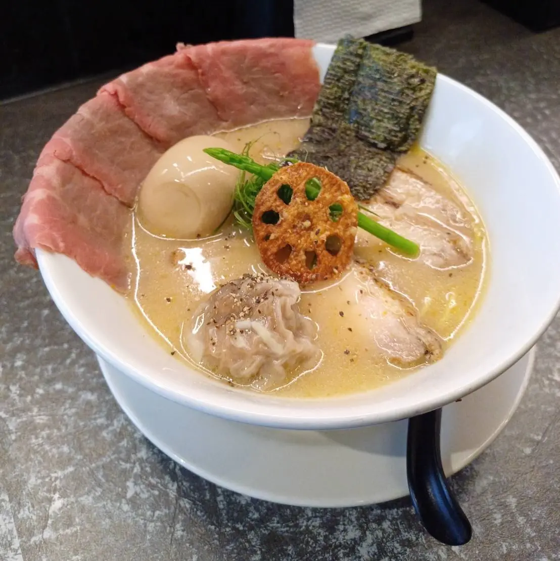 用餐當天吃的是牛骨原湯特盛,有四片牛肉、三片雞肉,首先舀一口來喝,牛骨熬出的白湯濃稠度恰到好處,舀起來帶有膠質感,入口卻不厚重,收尾乾淨,還帶有淡淡回甘;牛肉以舒肥的方式處理,肉香濃郁、入口即化;雞叉燒由雞腿肉製成,舒肥候再炙燒表面,肉質緊實有彈性,油脂香氣明顯;蓮藕、蘆筍則是畫龍點睛的存在,清爽平衡;主角麵體則是使用立成製麵的中粗麵,Q彈有嚼勁,非常好吃!