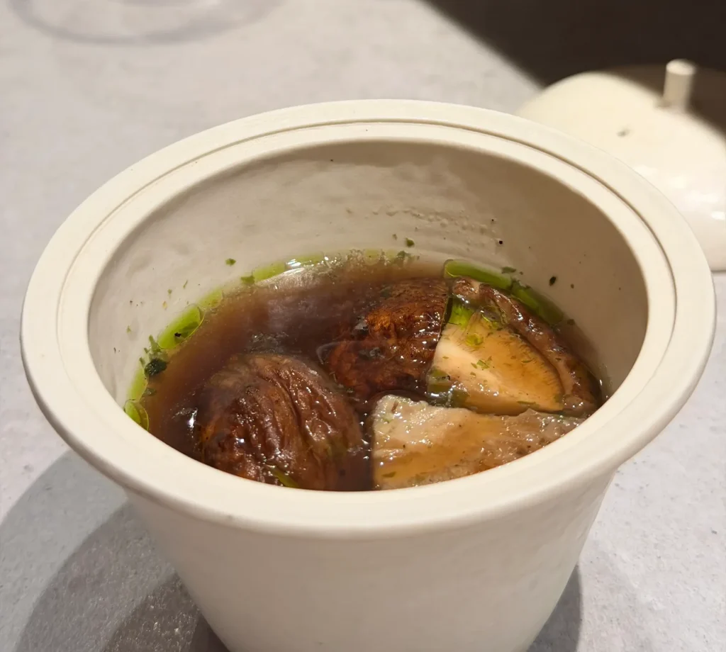 這碗澄清湯是主廚Kai致敬法國餐廳—Passage 53的一道湯品,以炭烤香菇為主角,多汁飽滿、香氣四溢,再撒上些許海苔粉提味,整體味道濃郁卻不厚重,喝起來十分清爽,好喝又暖胃!