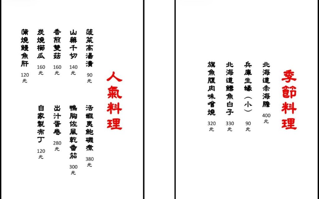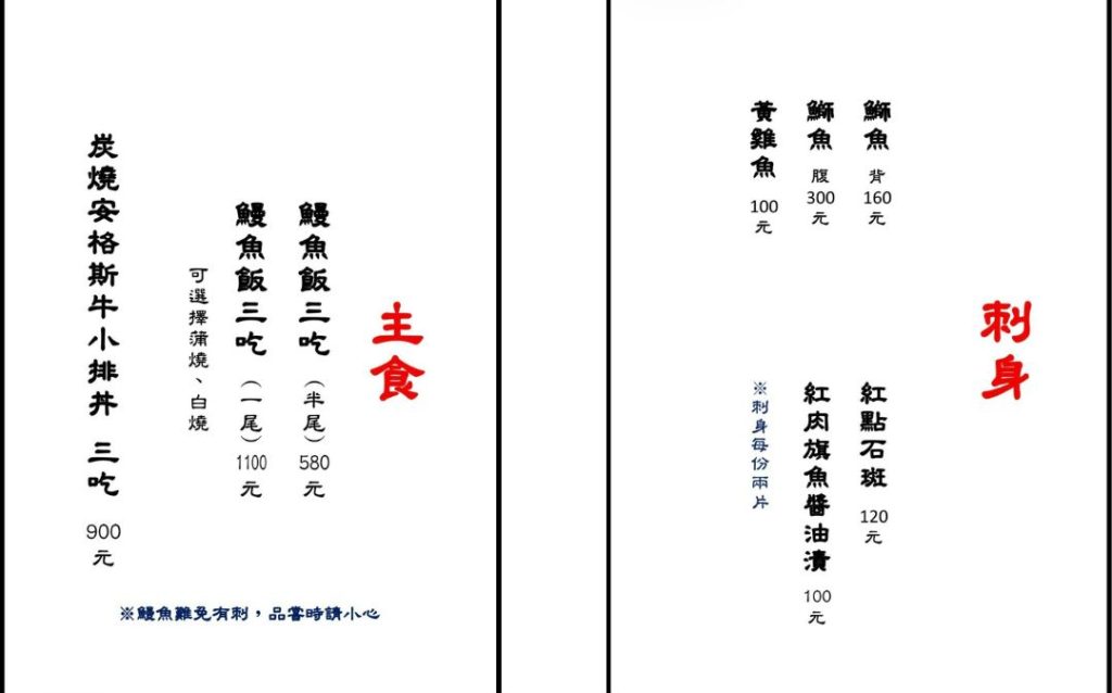 附上菜單給大家參考,整體品項非常豐富,主食的部分除了鰻魚飯之外,也有安格斯牛小排丼;刺身與季節料理的選擇同樣不少;酒水的部分選擇也十分多元,想簡單吃個飯或搭配小酌都很適合!