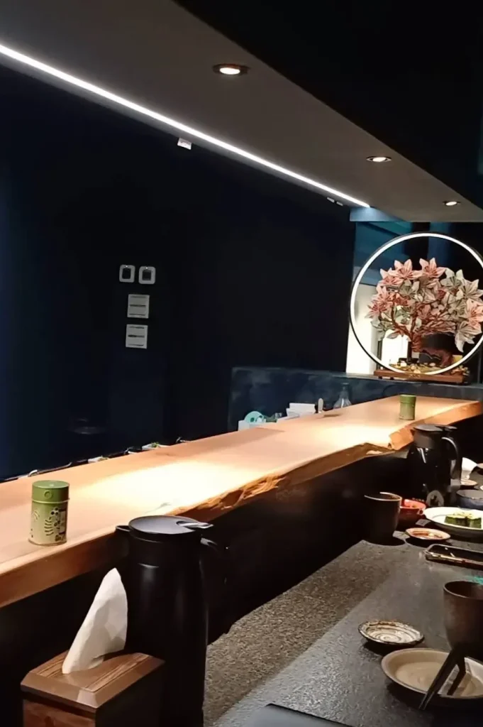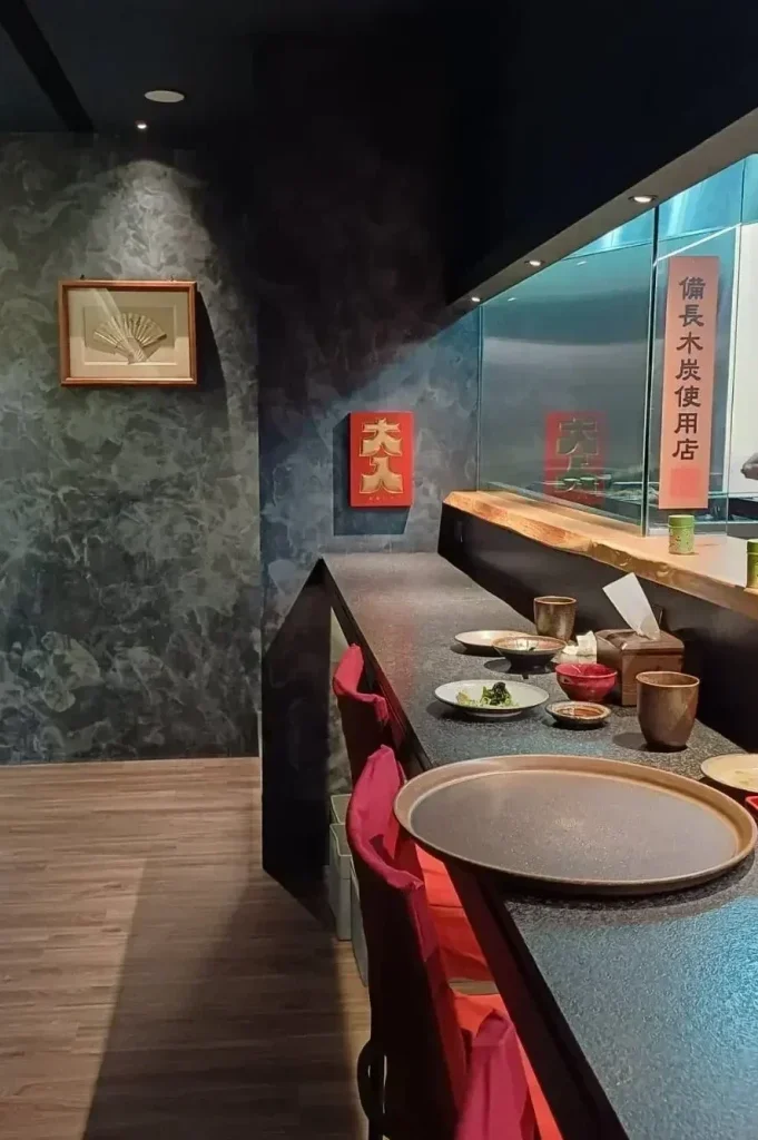 日式裝潢,深藍色的牆壁與木製板前桌,靜謐中帶點低奢感,一樓有板前座位與一般桌席,二樓全桌席,目前2樓尚未開放,座位不算多,想吃建議提前預訂!