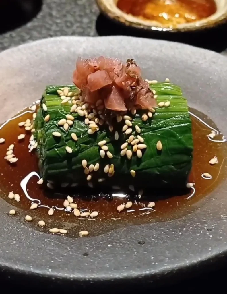 一入口先感受到菠菜本身的清甜,高湯襯托出菠菜本身的風味,撒上白芝麻增添香氣,最上面搭配濟州南高梅,是日本和歌山縣所產的梅子品牌,非常好吃!