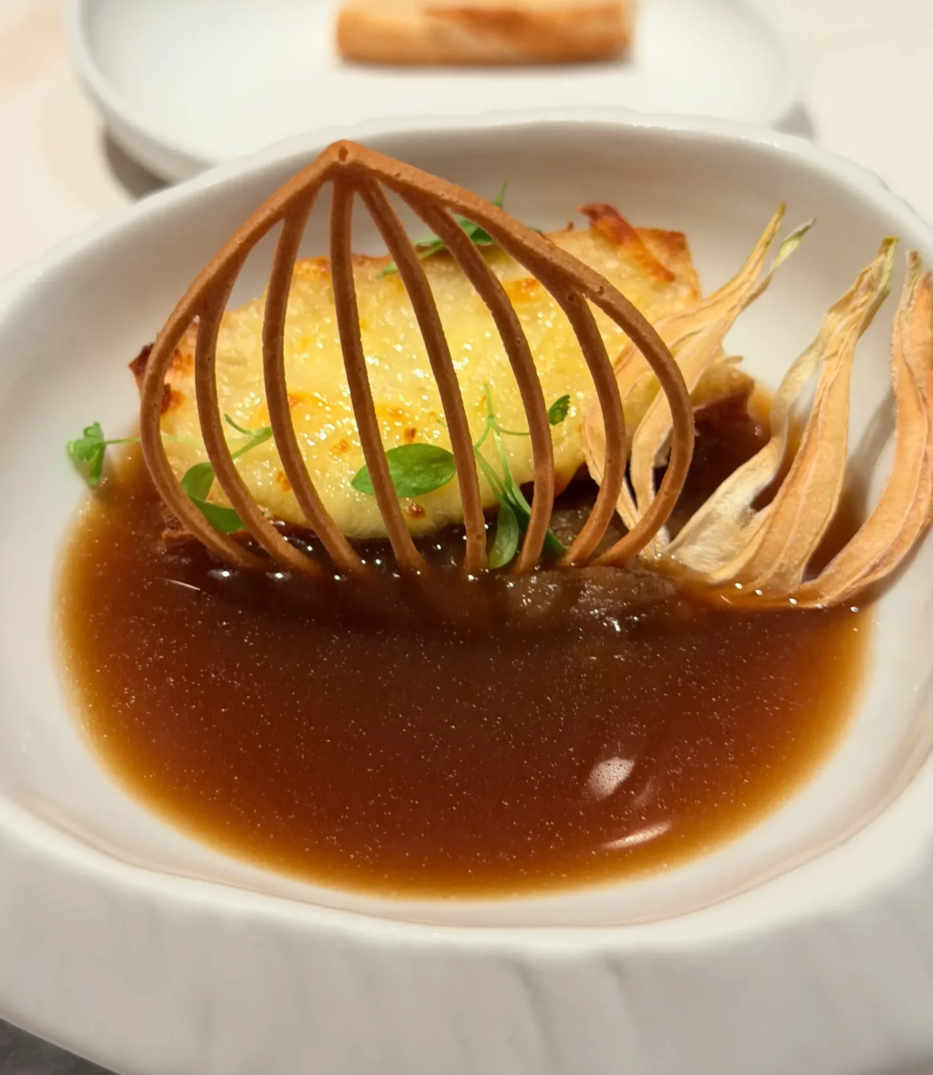 洋蔥經過長時間熬煮後散發出的天然甜味,濃郁溫潤的雞湯與洋蔥的鮮甜融合,口感深邃又暖胃,非常細緻的湯品