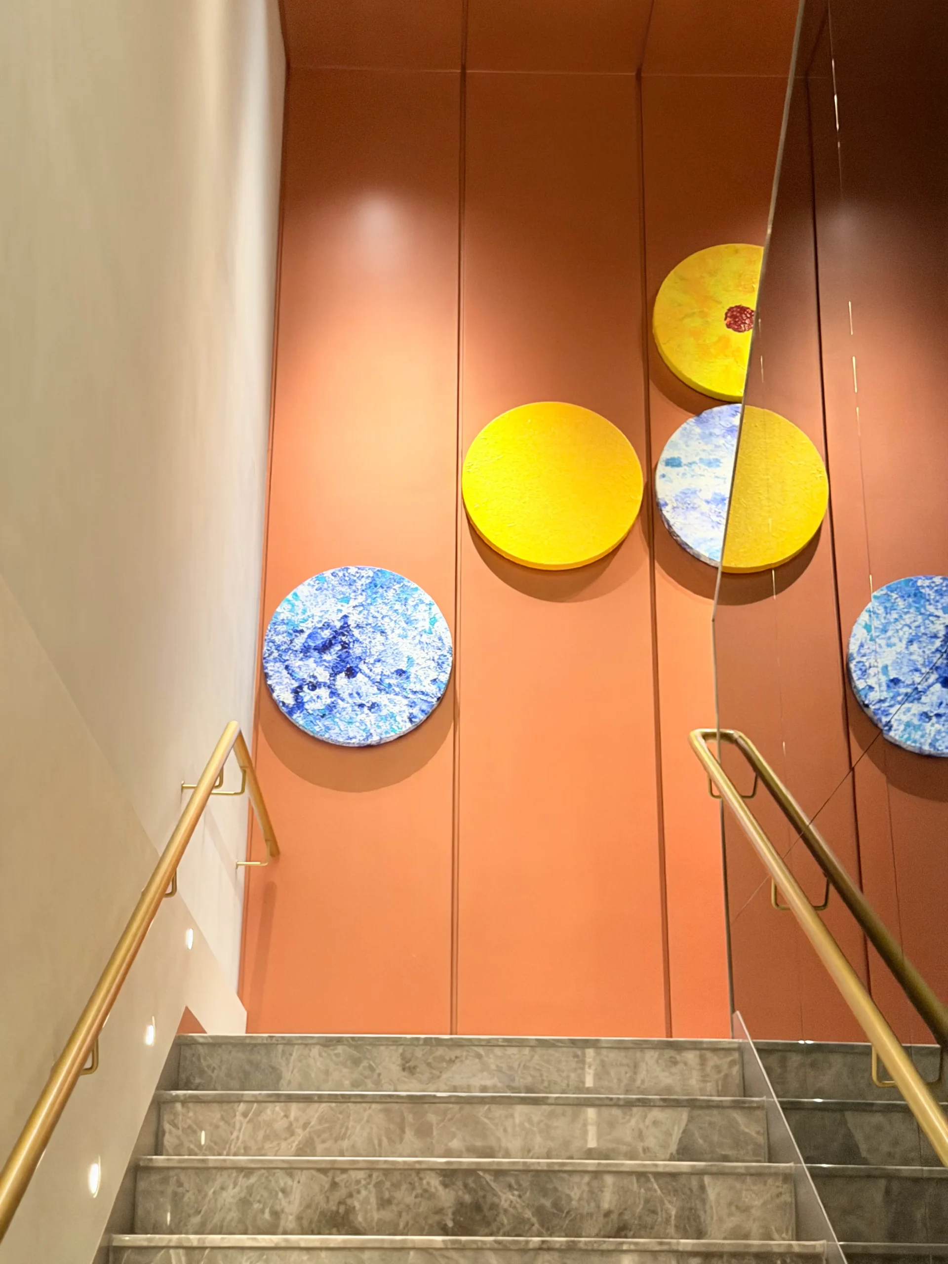 大理石面的樓梯,搭配金色扶手,帶有低調的精緻感,搭配暖橘色的牆面與藝術裝置,視覺上活潑又不張揚
