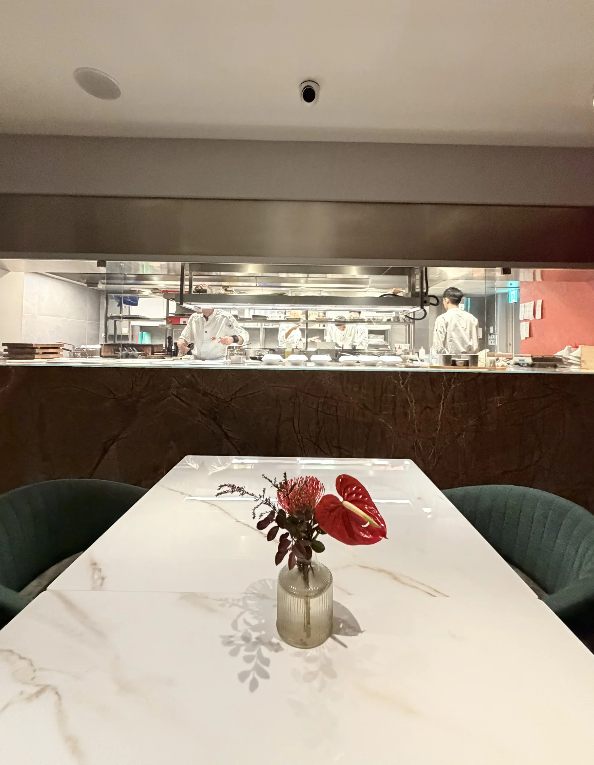 採開放式廚房可以欣賞主廚烹調與擺盤過程,的桌位選用白色大理石桌面,打造精緻舒適的用餐空間
