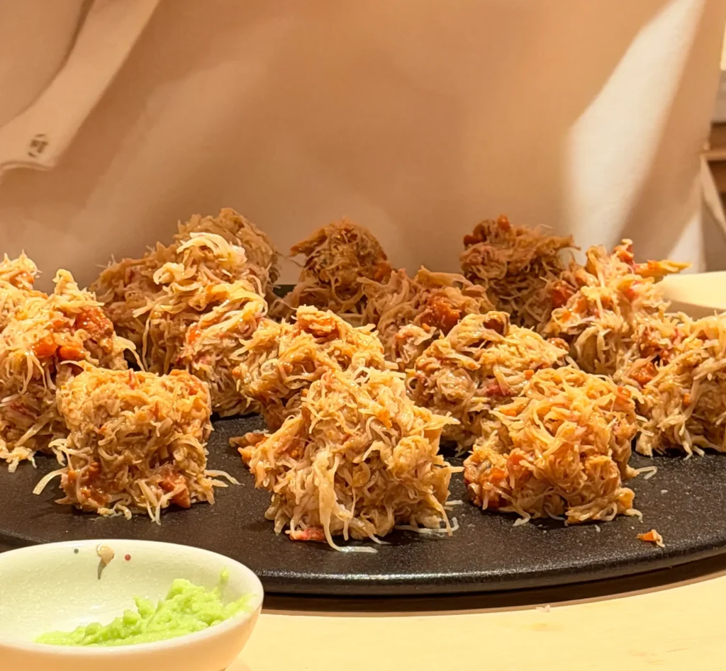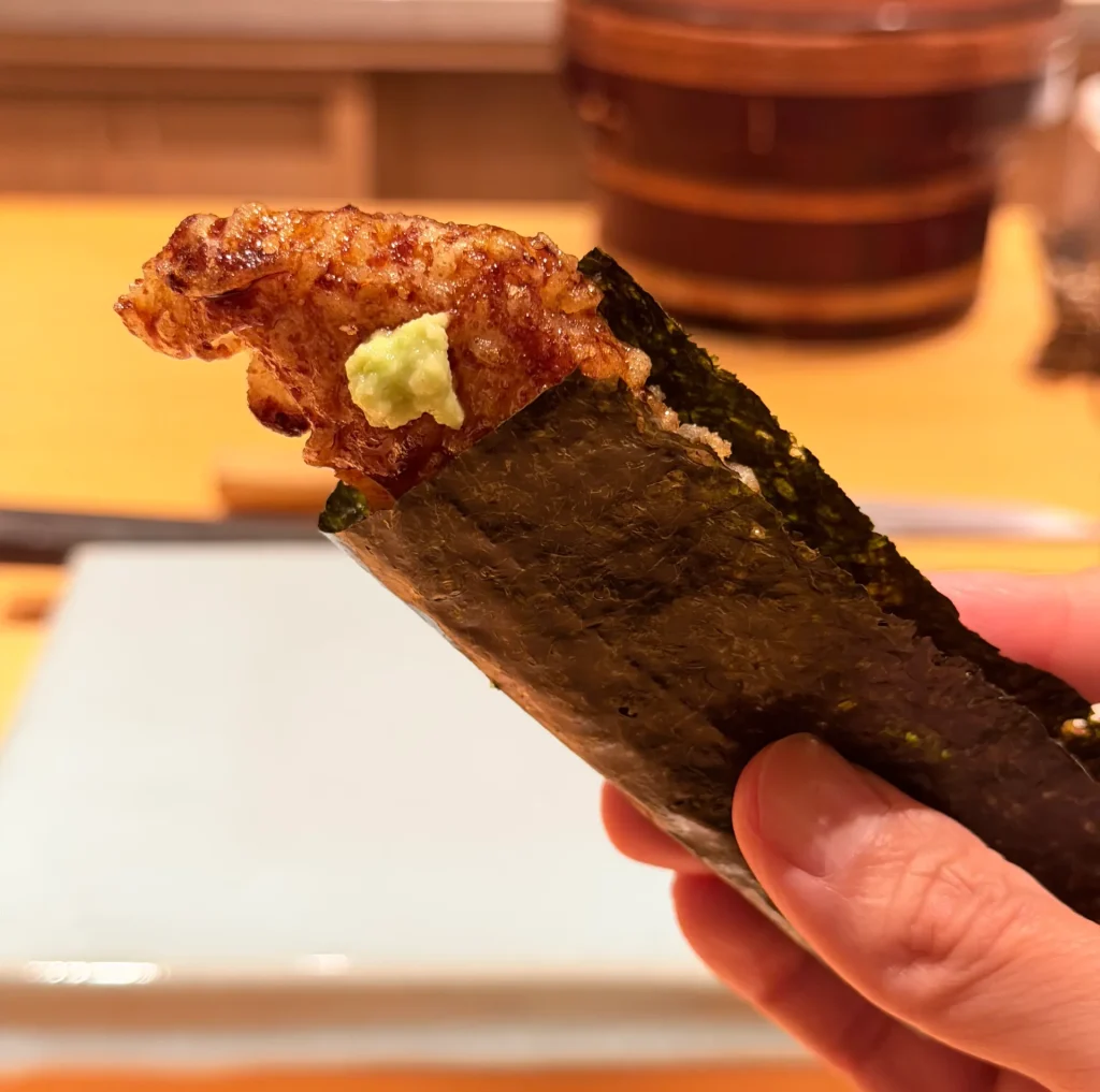 天本的招牌菜之一,炸過的麻糬更加綿密軟糯,帶點黏牙的口感,搭配滿滿的烏魚子醬,再以香脆的海苔包裹住,口感層次豐富、海味濃郁