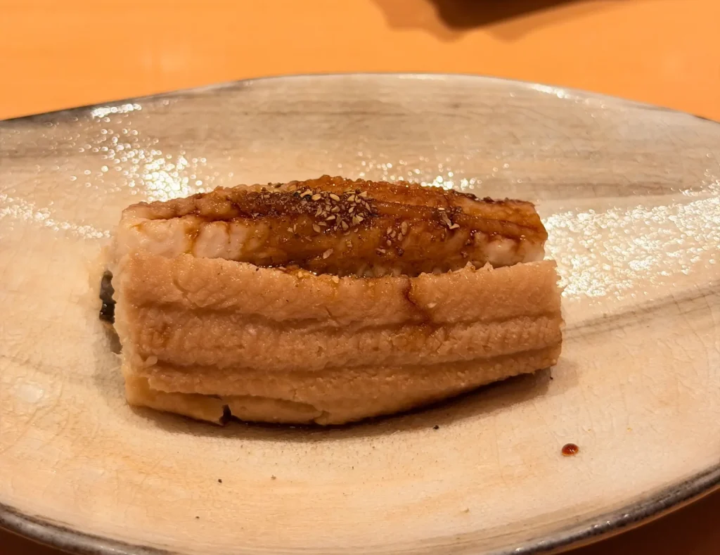 穴子口感綿密、入口即化,表層經過炙燒,散發淡淡焦香,刷上特調醬汁,醬香濃郁,與穴子的油脂完美融合