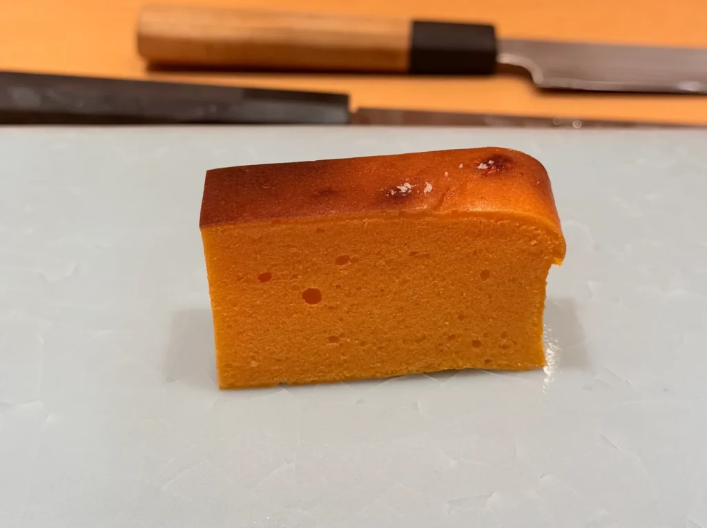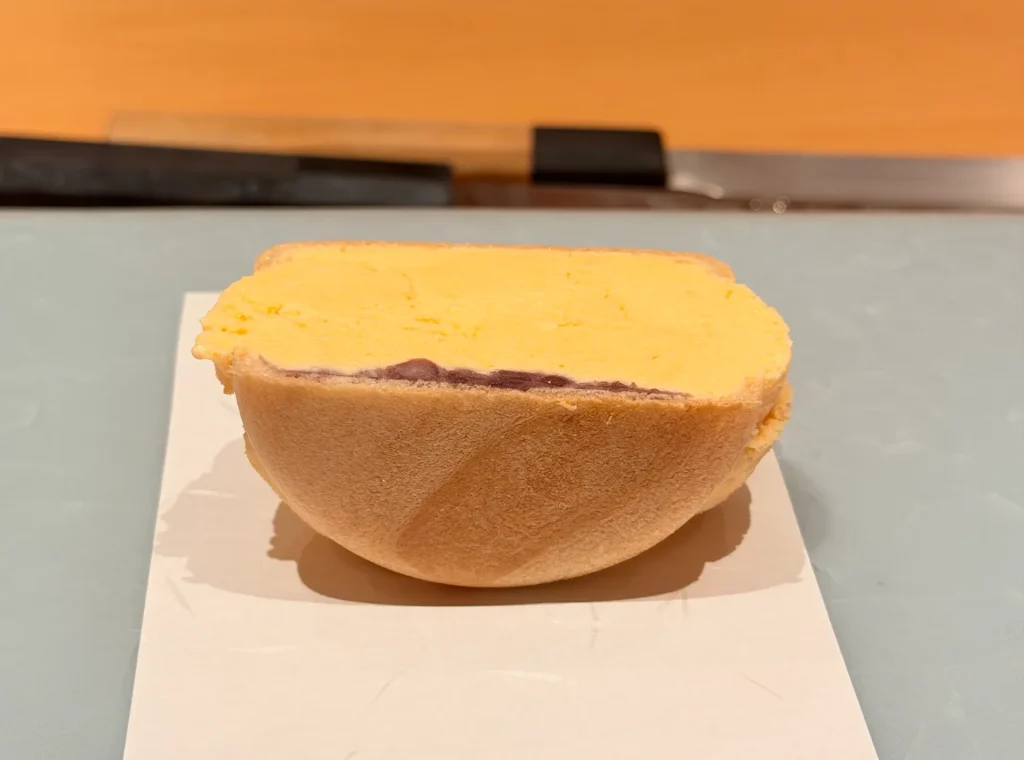 天本的招牌之一玉子燒,口感介於海綿蛋糕和布丁之間,濕潤綿密,中間帶有一點流心的口感,非常特別,很好吃!