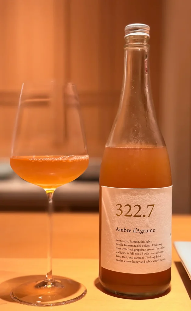 來自台東鹿野的茶酒,經過兩次輕微發酵的紅烏龍,結合新鮮葡萄柚香氣,是晶瑩剔透的琥珀色,酒體飽滿,帶有蜂蜜、焦糖的香氣,尾韻帶有煙燻、木質香調